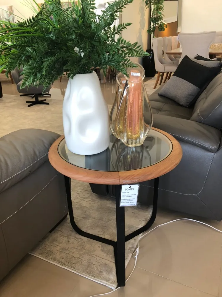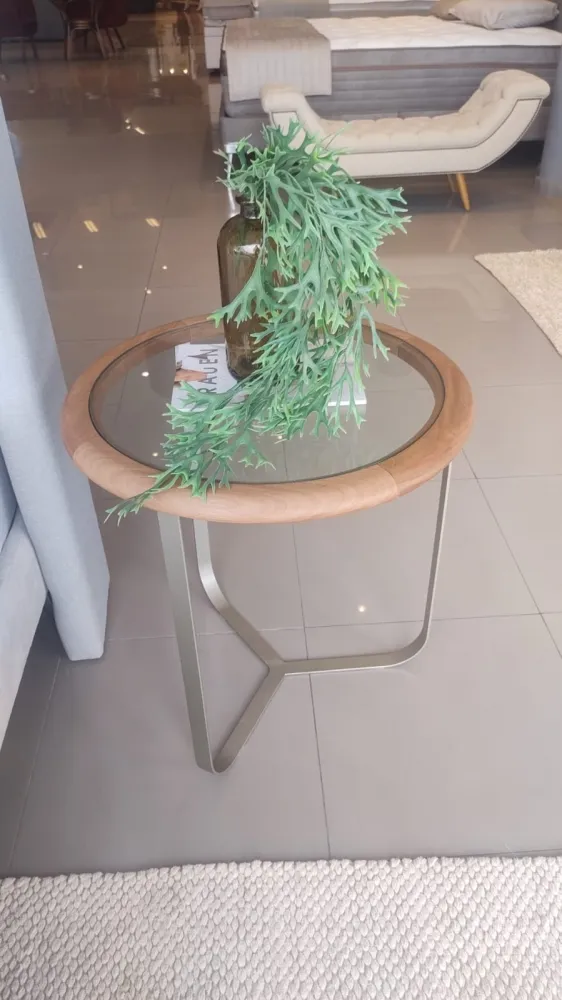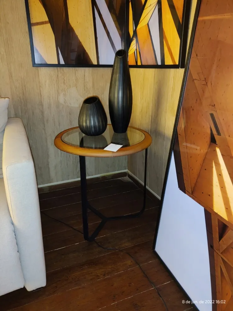 Fabricada em madeira maciça jequitibá, tampo em vidro 8mm e com pés em aço carbono.